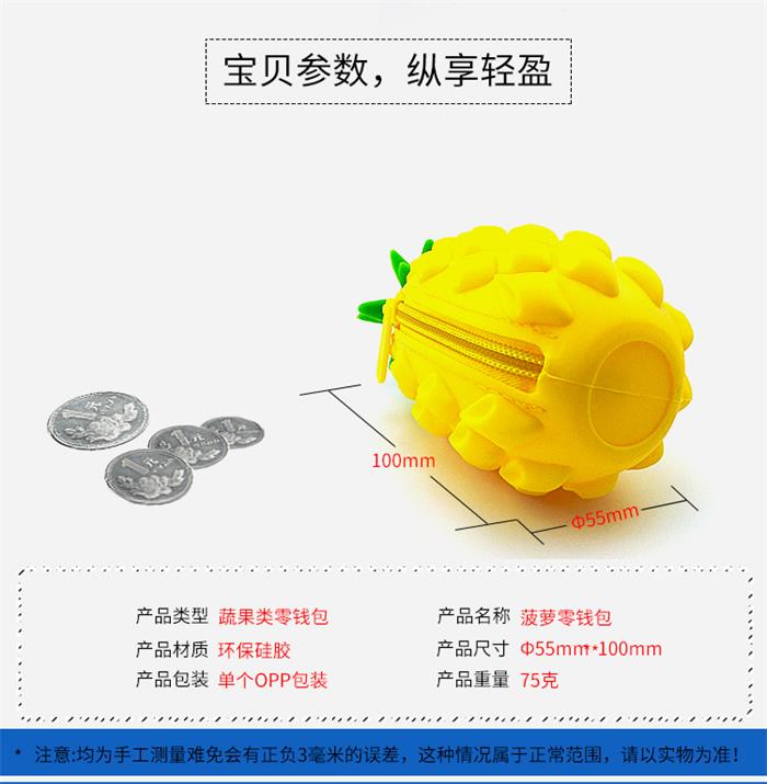 產(chǎn)品特點:此款仿真菠蘿硅膠零錢包防水耐用抗老化,軟硬適中有彈性,安全無異味,不易染臟可水洗;彈性、韌性好,撕裂強(qiáng)度高,平整度好,抗溫強(qiáng)度高等。
